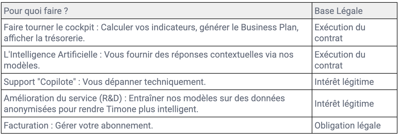 R&D interne : Timone peut utiliser des données totalement anonymisées et agrégées (rendues impossibles à relier à votre entreprise) pour entraîner ses propres modèles de prédiction (ex: statistiques sectorielles).